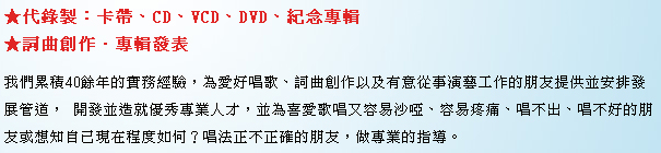 。歌唱教學·音樂製作 是您完成音樂夢想的地方/。曜輝出片歌手:呂秋霓、李雨璇、藍詠詩、許夢格、龍影新發專輯,來電預購,歡迎試聽